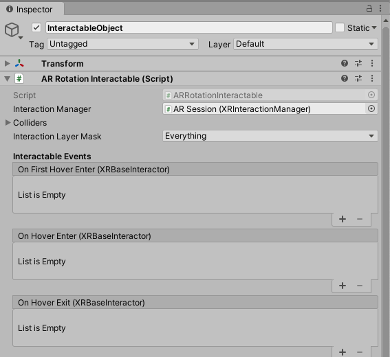 그리고 선택, 회전 , 크기조절 Interation 스크립트에 Interaction Manager로 AR Session을 추가했다.