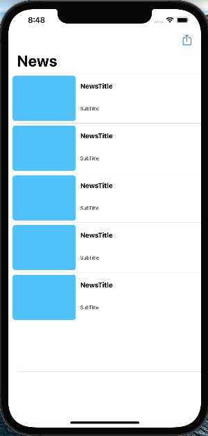 import Foundation import UIKit class NewsTableViewCellViewModel { var newsTitle: String? var subTitle: String? var urlToNews: String? var urlToImage: String? var newsImage: UIImage? = nil init(newsTitle: String?, subTitle: String?, urlToNews: String?, urlToImage: String?) { self.newsTitle = newsTitle self.subTitle = subTitle self.urlToNews = urlToNews self.urlToImage = urlToImage } }뷰의 뉴스타이틀과 서브타이틀에 들어갈 newsTitle, subTitle 프로퍼티를 만든다.